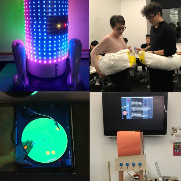 U.F.O. Bellies (Miyeon Kim, Yue Lin, Xianghan Ma, Xiaomeng Tang [Maximity]): A color trick game that requires the players to find the color of the word, not the text of the word itself. There are two teams with two players (total 4 players) and each one of the player wears the U.F.O belly that is covered with 3 primary color pads. Their goal is to complete the game fasterthan the other. The four players is catching the color of the word on the screen and find the right color from the belly by rotating it and bumping into each other.