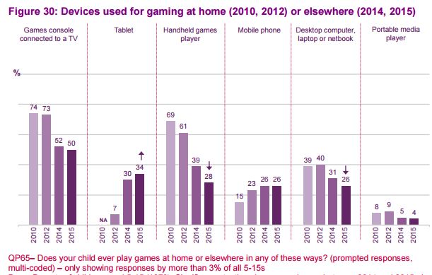 For example, it’s interesting to note that in 2005 Oxcom reported 84 percent of children aged 8-11 and 85 percent of kids aged 12-15 regularly played games on a console; today, those numbers have fallen to 71 percent and 68 percent, respectively.