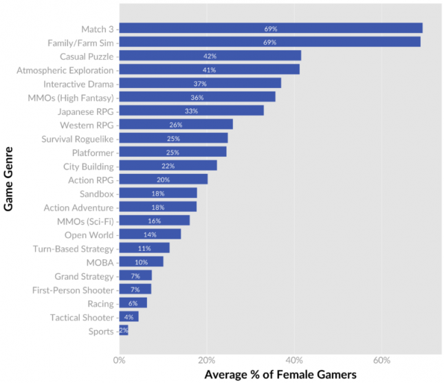 By contrast, women accounted for just 2 percent of the people who said they like playing Madden or FIFA, and 4 percent of those who enjoy playing tactical shooter games like Rainbow Six Siege.